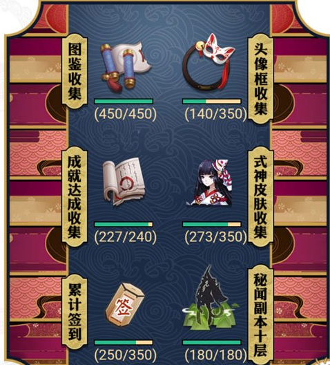 式神皮肤收集:每收集1个记7分,最多可获得350分