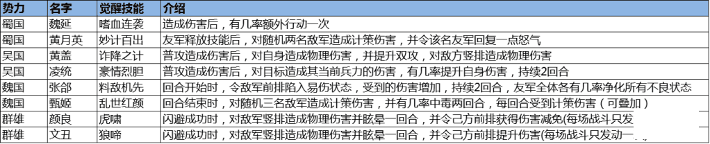 改为:兵力低于50%时,对敌军前排造成自身带兵数3/6/9/12%的伤害,并使场上友军提升40%的伤害,持续3回合(每场战斗只发动一次)