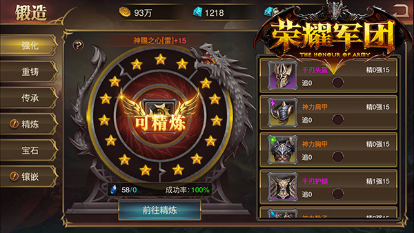 等级提升后可以对装备品质的需求会更加强烈,装备强化也可以大幅度提高战斗力。装备强化分为三点,强化、精炼、追加。玩家使用升级宝石即可强化装备,强化至+15可以开启精炼,精炼后才可继续强化。精炼后则会增加额外属性并且提升大量战斗力。精炼会消耗魔晶,精炼不会失败,一件装备精炼的次数越多,提升战力越丰厚。角色三转开启追加系统,追加的次数越多战力提升越明显,但是相对消耗的材料天醒宝石也会越多,装备可以传承,直接把强化、精炼和追加的属性都传承到新装备上,所以不用担心更换装备后掉战斗力的烦恼。