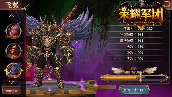 “飞翼”系统玩法十分的炫酷,我们在满足一定等级后会获赠一款初始一阶飞翼,人物在装备后可以获得攻击力、物理防御、魔法防御等等诸多属性的永久加成,可谓一大神器!飞翼可通过消耗烈焰宝石来进行升星操作,当飞翼升星到达10星则开启进阶功能,可通过消耗神圣之羽进行进阶操作,都可以永久提升飞翼的附加属性;而飞翼进阶之后,飞翼形态也将发生改变,属性也将大幅度的提升!