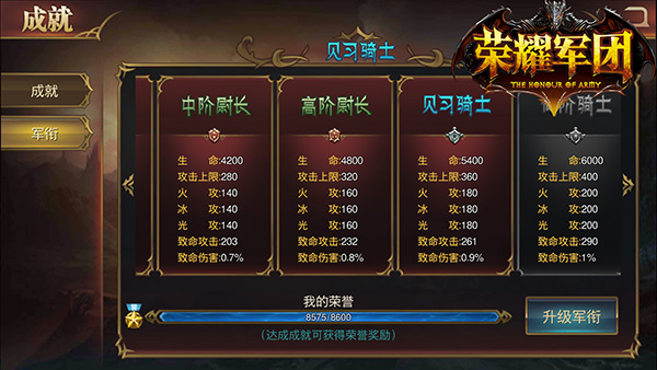 军衔系统是角色提升战力的又一途径,军衔会增加角色的生命值、攻击上限、属性攻击等。但提升军衔则需要先获取荣誉值。荣誉值则是达成成就之后获得的奖励,伴随角色不断的成长,会达成特定的成就,就会获得荣誉值以及钻石奖励。是用来提升军衔和获取道具最有便捷的系统