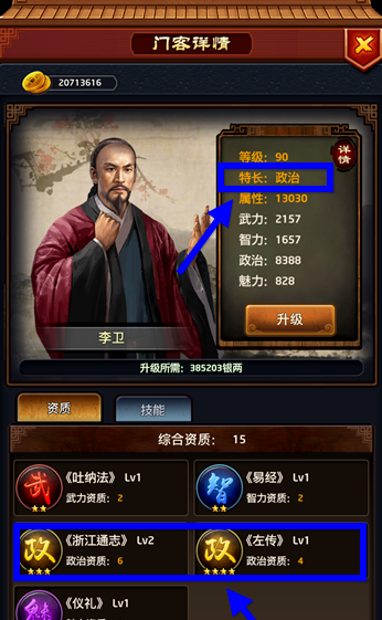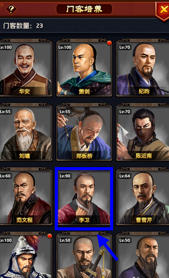 接着我们点击门客,找到合适的门客人选。假设打开的卷轴为政治属性,那么接下来我们要找的门客最好也是擅长政治的。