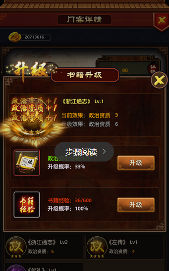 找到门客对应的书籍,查看升级成功率,点击升级即可。门客的等级越高升级失败的可能性越大,小编建议等级比较高的门客用书籍经验来提升资质哦。