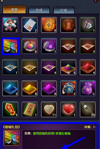 找到【强化卷轴】后点击选中,然后在页面最下方点击【使用】,可随机获得任意属性的卷轴。