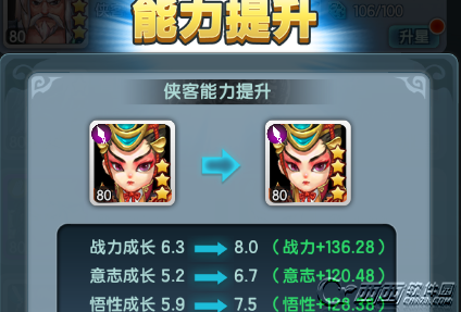 侠客升星后,其战力、意志、悟性的成长速度获得提升。