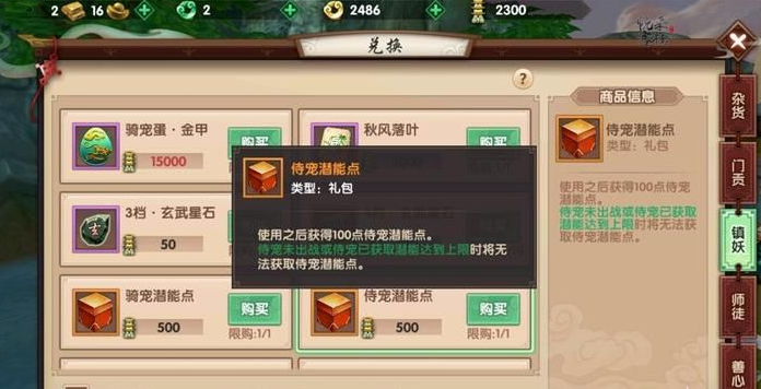 潜能值的获取途径有很多种,首先我们可以通过日常的探索来进行获取,当我们探索出名为灵宠上人的仙友时,就可以与其对话获得120点潜能值了,别小看这120点潜能值哦,它可是可以让一个技能提升一个等级的呢。虽然探索出灵宠上人的几率一般,但运气好的话,每天还是能够探索出几次来的呢。另外我们也可以通过兑换系统中的镇妖商店来兑换,在镇妖塔商店中选择侍宠或者骑宠潜能点,就可以用500声望换取100点宠物潜能值,但是需要注意的是,宠物必须得在出战状态并且获取潜能值没能达到上限才可以哦,仙友们快去兑换吧,让宠物学会更多技能,我们才会变得更强大。