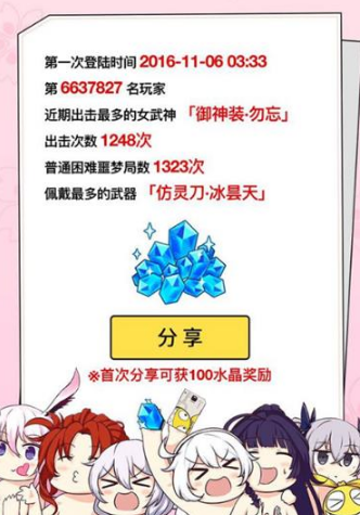 首次分享就可以获得100水晶奖励,没有收到的玩家在邮件查看一下,会在3个工作日内发放完毕。
