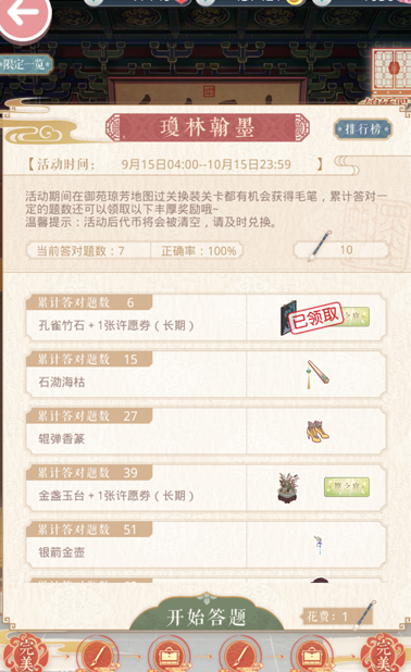 答题是需要毛笔的,在御苑琼芳地图过关即可获得毛笔,活动时间有一个月,大家可以慢慢来。