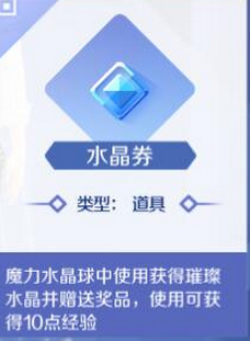 玩家在QQ炫舞手游中可以通过商城购买水晶券,一个水晶券的价格为100点券,通过将水晶券使用到魔力水晶球中,就能够获得大家想要的璀璨水晶了,与此同时还会有许多丰富的奖品赠送,使用后还可以获得10点经验哦!