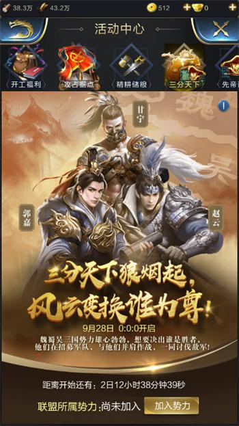 选择势力要谨慎,如果需要更改势力需要金币才能更改,而且还要清空联盟的所有玩家的个人积分和个人功勋,所以势力选择了最好就不好更改了,除非是逼不得已的,在活动开始前的前3天就可以选择势力了,我们的盟主和官员可以选择一个势力进入,有魏国、蜀国、吴国,这个三个国家可以选择。