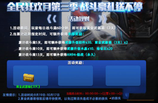全民狂欢月第三季开启啦!~本活动从9月19日起到10月17日截止。期间只要能战斗满60分钟即可赢得相应奖励!累积15日达标即可获得全新武器AN94-极战(永久)!