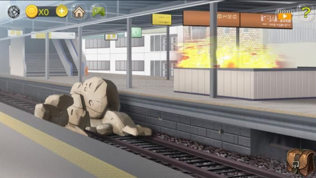 然后仔细看轨道的下方洞口,把海报放在洞口下走老鼠,拿到阀门和提示纸。