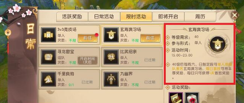 40级后每周六、日指定段可单人或组队报名【玄海演习场】,每日首胜可获得丰厚奖励,每日只可获得首胜奖励,20金票、灵酒(白)、银票5000。