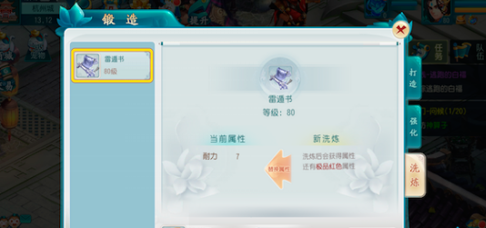 40级以上装备才可以进行装备洗练,洗练的时候装备不可以穿在身上。装备洗练需要消耗洗练石和银币,洗练可以重置装备的附加属性,如果洗练不满意可以不保存洗练的属性而保留洗练前的属性。