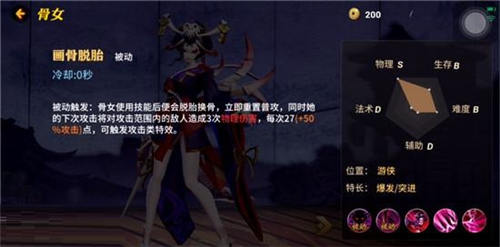 骨女使用技能后便会脱胎换骨,立即重置普攻,同时她的下次攻击将会对攻击范围内的敌人造成3次物理伤害,每次27(+50%攻击)点,可触发攻击类特效