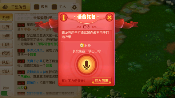梦幻精灵在固定时间点发送语音红包后,等级≥40级的玩家可以点击系统频道消息领取并打开,开启红包后,玩家将会获得各自特定的红包口令,长按录音将口令念出来即可;而后,系统会将其录制并根据准确度进行评分,评分达到50分以上的玩家,将有机会赢取金刚石、定魂珠等丰厚好礼!而若玩家所处场景不方便进行语音录制时,则可以将语音红包存入包裹,24小时内均可在包裹中将其开启。