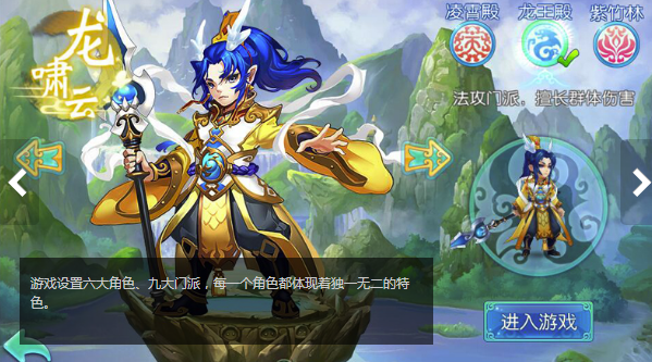 龙王殿为法攻门派,该门派的弟子擅长群体伤害。可选龙王殿的角色为:百花仙,龙啸云