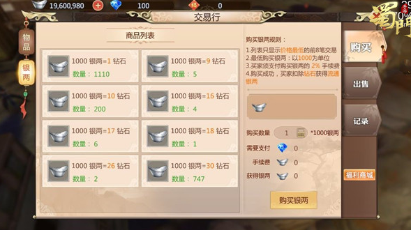其次,由于在不久前的新版本中,开放了流通银两交易功能,在交易行中,除了通过上架装备贩卖以外,花费少量钻石进行流通银两的购买也不失为一种更加快捷和高效的方式。