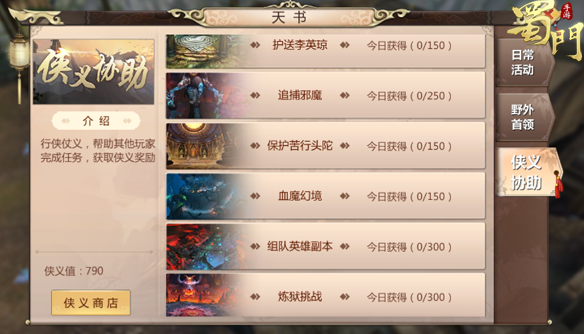 玩家可以通过天书活动和挑战副本来获得侠义值,而根据活动的不同,获取侠义值的上限也不同。