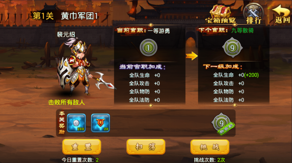 每成功挑战一关即可获得本关通关奖励,通关后该关卡可开启扫荡模式,以后挑战无需进入战斗,可直接扫荡获得奖励。