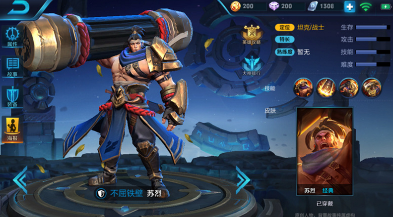 作为坦克英雄技能机制都都相对比较简单,苏烈1技能强化普通效果并不需要过多操作,2技能效果类似于项羽的推土机操作,3技能类似于孙悟空的大棒子不过持续的效果更长;