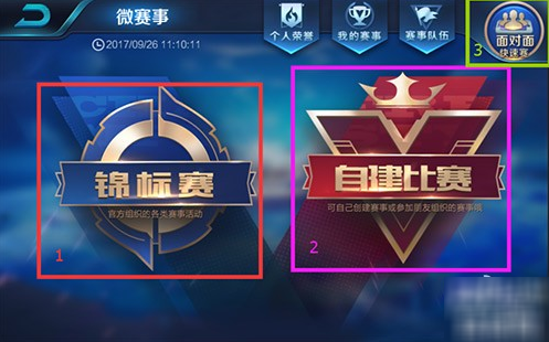 1.进入到微赛事系统,这个入口就是原先的赏金联赛,更新后分城三部分,锦标赛、自建比赛、面对面快速赛