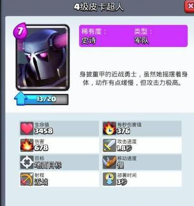 总结:作为一张7费卡,从血量上看超级骑士是一张和皮卡一样可用于推进反击的坦克,同时因为能跳跃所以其进攻的节奏更快,跳跃伤害威胁大且能克制地面的群体单位,但是其一旦被打断后普通状态下的超级骑士远不及大皮卡,输出仅和黑暗王子相当,此时单挑能力较弱。