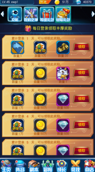 这种7日活动的套路想必很多老手已经很熟练了,每天元宝体力精力都买完,前7天不顾一切的冲级,每天等级和战力达标的奖励可是很丰厚的,剩下的元宝基本跟着7日活动走,藏宝图记得能买全买了,后期藏宝图可以去换神级数码兽的。