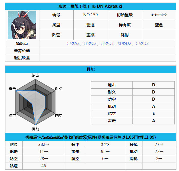 六驱精锐·晓:与任意第六驱逐舰队成员(响、雷、电)同时出击时,炮击、雷击、装填提升5.0(15.0)%,效果不叠加。