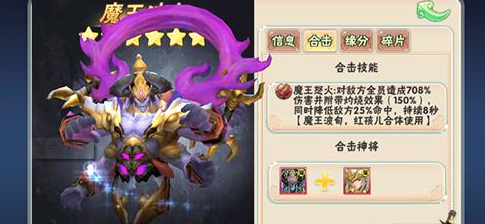 魔王怒火(合体技能):对敌方全员造成708%伤害并附带灼烧效果(150%),同时降低敌方25%命中,持续8秒。