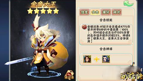 1、银角:对血量最少的己方武将治疗80%伤害的生命值,20%概率自身闪避提升10%,持续5秒。
