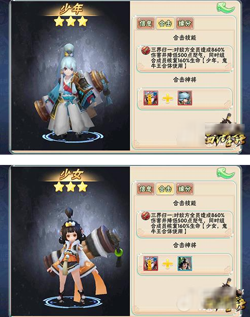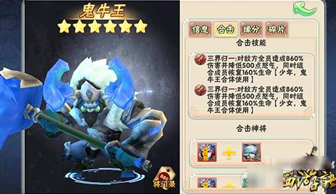 三界归一(合体技能):对敌方全员造成860%伤害并降低500点怒气,同时组合成员恢复160%生命。