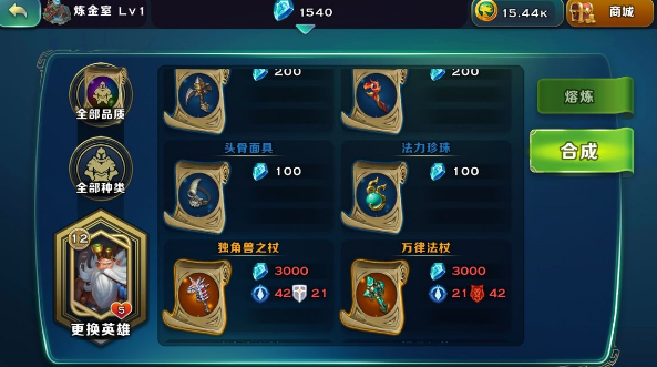 2、消耗对应数量炼金石及英雄体力合成指定装备