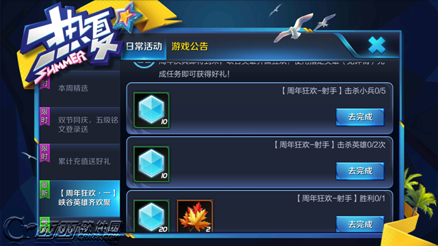 王者荣耀周年狂欢射手是谁,2017王者荣耀周年狂欢射手任务9月30日上线,使用周年狂欢射手指定英雄击杀小兵和英雄就可以完成任务,并且获得铭文碎片和枫叶奖励,那么王者荣耀2017周年狂欢射手是谁,西西带来周年狂欢射手指定英雄介绍,希望对大家有所帮助。