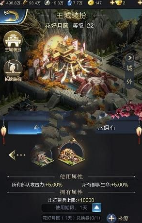 花好月圆:王城装扮是不错的比鹊桥仙好看一点,属性是部队攻击力+5%、部队生命+5%、出征上限+10000,有一天的、三天的、七天的和永久的,如果想要抽到永久的需要抽200多次,才有机会抽到。