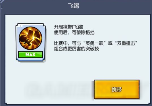 它是由飞踢和头槌融合而来,前置技能为飞踢,升级抽头槌技能,效果和飞踢一样,但是会连续踢两次,踢的距离远。