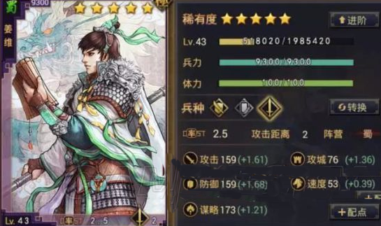 从姜维的面板属性可以看出,他的攻击、防御、谋略初始值和成长值都很均衡,没有明显的短板。