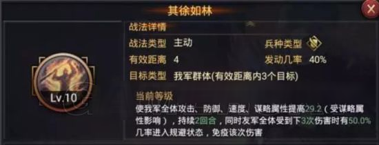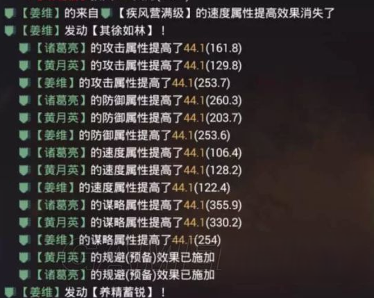 1、我军全体(3目标)攻击、防御、速度、谋略属性提高。表面上看,属性加成不多,但在实战中,通过各种加成的累积,该技能单属性可以加到50点左右。也就是说3个队友四维总加成点数在600点,持续2回合,并且能刷新,这是什么概念呢?