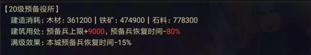 当然预备役所也要升到满级,满级预备役所可以提供高达12000的预备兵上限。如果部队足够强力,打赢两队之后获得的近万预备兵,可以让你的主力队伍在战败后瞬间恢复到正常状态。