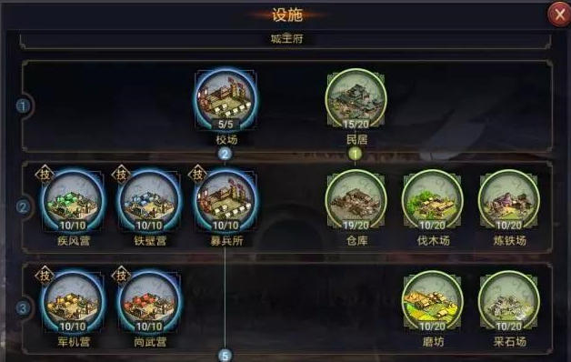 另一方面,主城内的建筑也需要优先将兵营和疾风营等设施升到满级。因为加入流浪军之后,这些建筑的加成是你与别人抗衡的基础,作为“以战养战”的流浪军,升级提升部队实力的建筑是必不可少的。