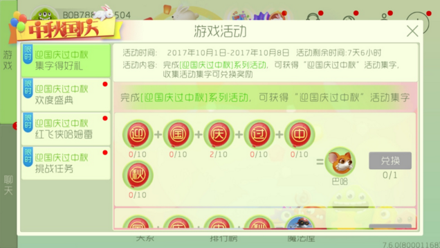 完成迎国庆过中秋系列活动,可获得迎国庆过中秋活动集字,收集活动集字可兑换奖励