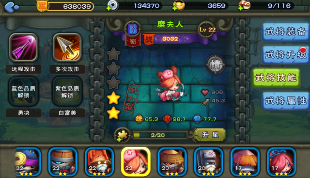 首先游戏里的武将都有三围属性,如今小编22级蓝色装备的糜夫人,统帅、武力、智力分别是69.8、101、83.0,并且在游戏里的定位是智力型的。糜夫人拥有伤害的主动技能,同时还拥有一定的群体伤害,甚至也还拥有非常不错的增益效果,虽然总体的输出看不到太亮眼的地方,但是作为一个后排的半输出半辅助还是可以勉强胜任的。
