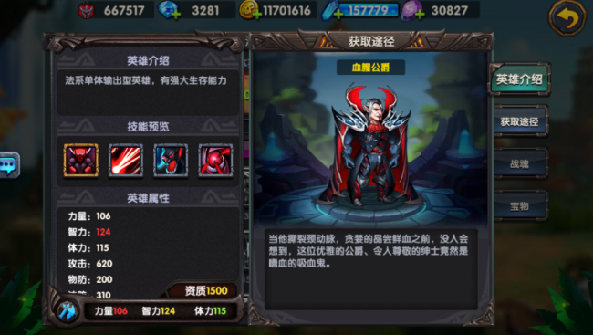 作为一个强大的法系伤害英雄,他拥有强大的输出能力,还拥有很高的吸血效果和流血效果,是比较受玩家喜爱的英雄。他的三围分别是力量106、智力124、体力115并且资质为1500,相对来说是非常值得玩家培养的英雄。