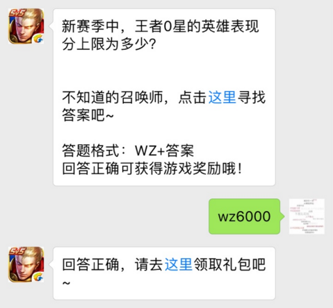 新赛季中王者0星的英雄表现分上限为多少?王者荣耀每日一题。王者荣耀微信公众号为大家准备了很多福利,其中就有每日一题活动,玩家完成答题即可获得奖励,今天的题目是新赛季中王者0星的英雄表现分上限为多少?下面西西小编来为大家介绍。