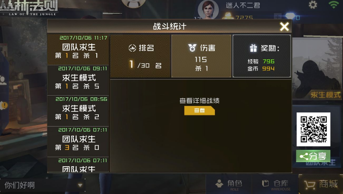 当玩家死亡后,队伍中只要有队友未死亡,死亡的玩家就可以点击队友头像进行观战。当同一队的玩家全部死亡后开始结算,结算以死亡先后顺序来进行排名,当最后存活队伍的人数》=2时,队员之间的排名需要按照击杀数量来排名,如果击杀数量一致,按名称先后排序。