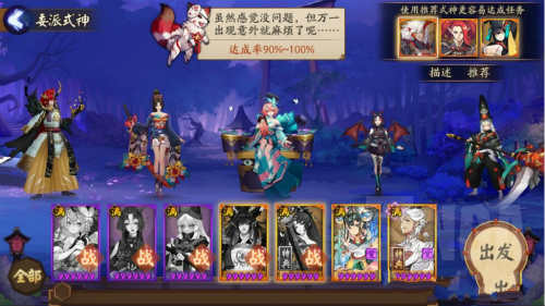 5、在式神派遣界面,拖放需要派遣的式神,最后点击“出发”按钮,即可消耗体力,开启任务
