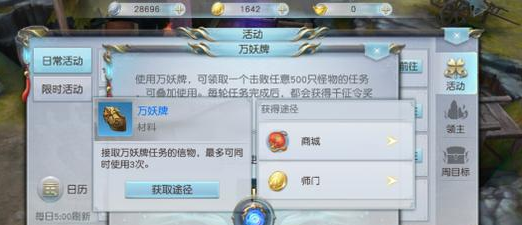 在获取千征令之后,使用千征令获取大量的经验,能够帮助玩家快速的进行升级。不过获取万妖牌的渠道较为稀少,第一是通过“商城”途径,在商城的元宝商店里面可以花费元宝进行购买;