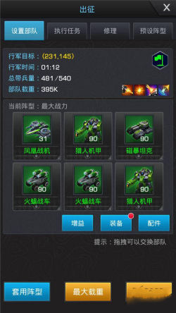 布阵分配上,建议要有战车和机甲来增加暴击和伤害加成。攻打无人占领的资源矿时,将战机放先手位,战机可以通过群伤快速削弱敌方全体的实力。