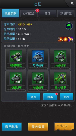 攻打被占领的资源矿或其他玩家基地时,如果对方实力明显弱的可以把战机放在一号位。如果对方是单体输出超高的战车放在一号位,战机易被秒杀,可考虑将机甲或者坦克放前排,作为肉盾吸收第一波伤害。