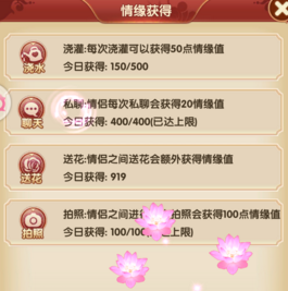 情侣间进行拍照会获得100点情缘值,每日上限100